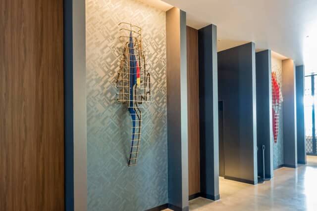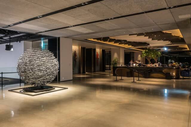 写真奥にはホテルのレセプションがあり、さらに奥はレストランになっています。地球儀を思わせる球体は、世界の主要サーキットコース44か所の形を組み上げた作品で、モータースポーツと地球環境が共存する重要性を表現。中には富士スピードウェイのコースが5つ隠れているので、是非探してみてください。