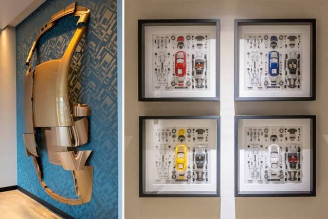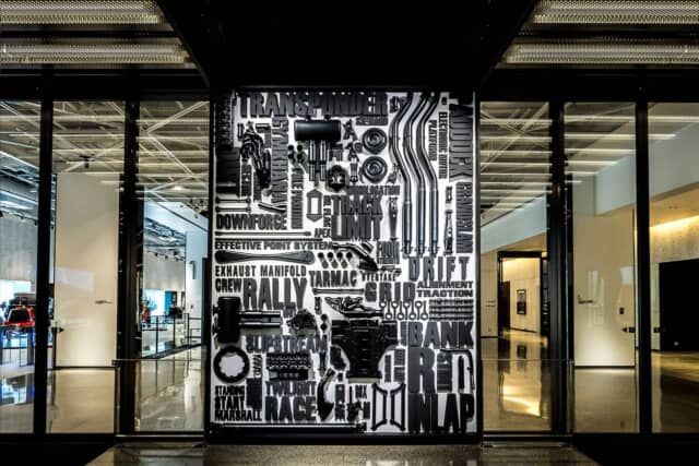 玄関を入ると目の前に現れるのが、モノリスと名付けられたアートワーク。ドイツのサーキット、ニュルブルクリンクを走ったレクサスLCのパーツと、「ダウンフォース」「トラクション」といったモータースポーツ用語を組み合わせています。