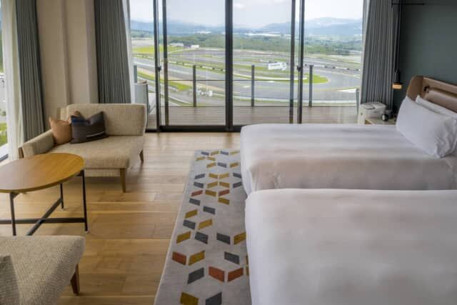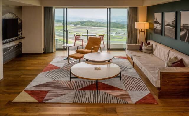 リビングルームとベッドルームを備えた86平米のスイートは、大きなソファーやテーブル、リクライニングチェアなどが置かれ、ゆったりとした間取りでスペースも十分。床は他の客室タイプとは異なりフローリングにラグマットを敷いていて、自宅にいるような日常感と、窓から見えるサーキットの非日常感を味わえます。