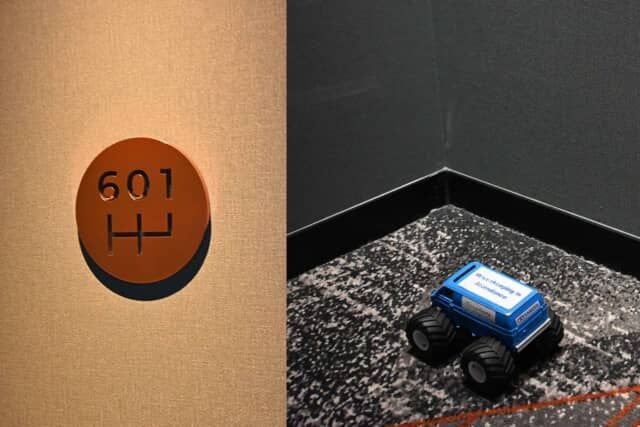 写真右のミニ四駆は、客室の清掃が行われている時のサインとして、ドアの外に置かれています。