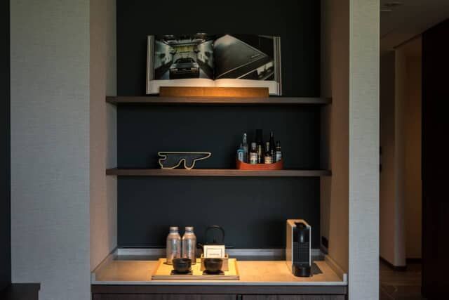 ミニボトルに入ったアルコール(有料)の他に、ネスプレッソのコーヒーマシンや静岡緑茶、ミネラルウォーターなどが置かれます。富士スピードウェイのコースをかたどった鋳物のオブジェや、自動車のスタイリッシュな写真集が飾られています。