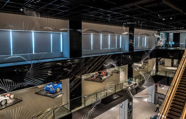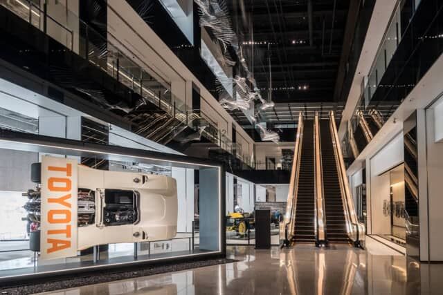 さらに驚かされるのは、1970年に登場した「トヨタ7(レプリカ)」が倒立展示されていて、迫力満点。左手にはミュージアムの受け付けがあります。正面のエレベーターに乗って3階のホテルエントランスへ向かう途中も、2階に展示された様々なレーシングマシンや名車たちを見られます。