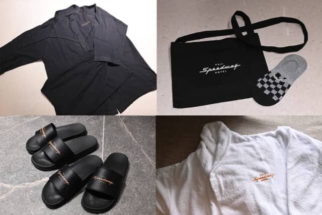 ホテルのパブリックスペースは、室内着やスリッパの着用がNGの場合が多いので、気軽に行けるのはうれしいです。そのためスタイリッシュなデザインを採用。さらにフランス・ガルニエティエボーのバスローブは肌触りが柔らかで、着心地も最高。鍵やスマホなど小物を入れられるサコッシュとチェッカ―柄の靴下はお持ち帰り可能です。