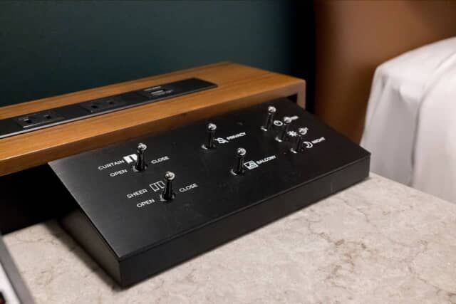 ベッドサイドにある照明などのスイッチ類は、ホテルはもちろん家庭でも見ることのないトグルスイッチを採用。パチ、パチ、パチっと小気味よく操作できるスイッチ類も、レーシングマシンのイメージです。