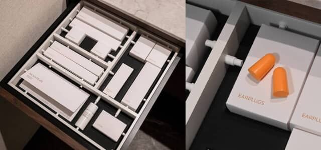 静岡県には有名なプラモデルメーカー TAMIYA があることから、アメニティの入ったボックスもプラモデルのパーツを思わせる配置です。歯ブラシやコットン、髭剃りなどのほか、なんとサーキットの音が気になる方のために耳栓も用意しています。