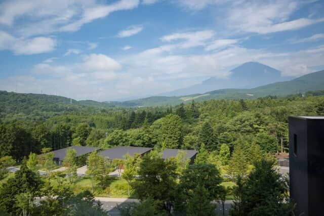 ホテルからは真西に位置する富士山。天気のいい日の出の時刻は、朝焼けが当たって赤富士が見られることも。手前に見える3棟の建物がガレージ付きのヴィラです。