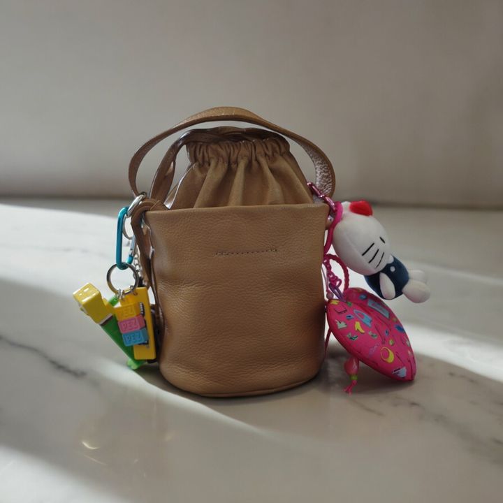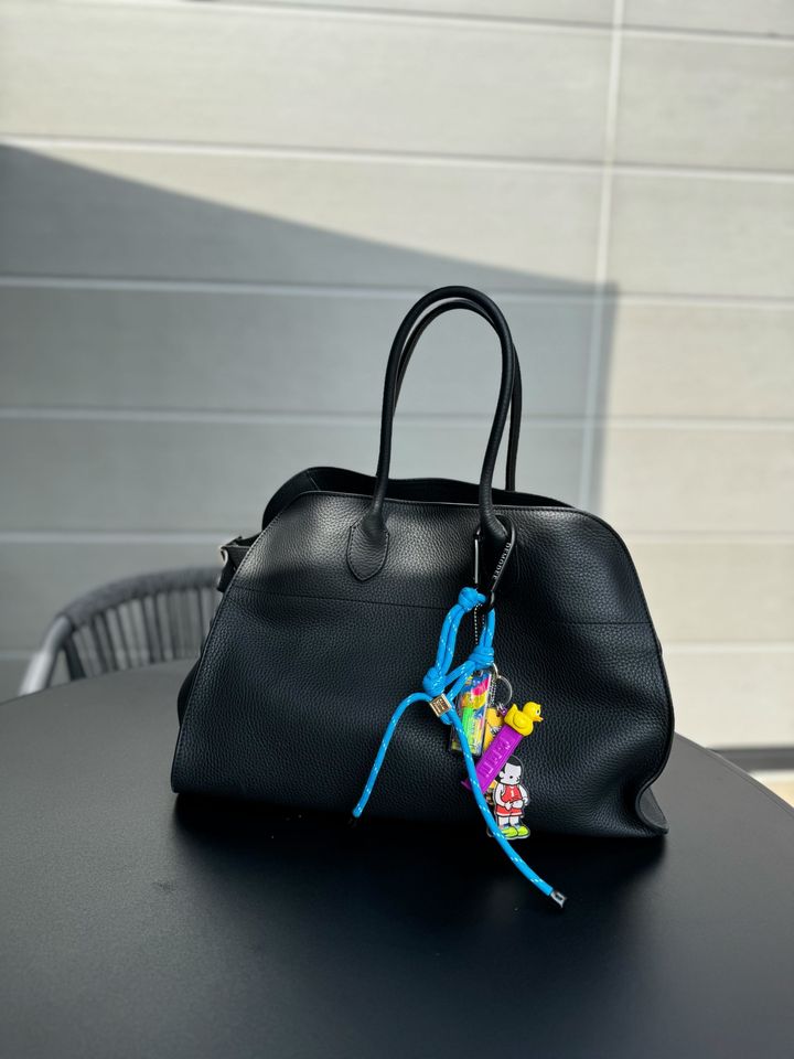 「背が高いので、普段からバランスのとりやすい大きめバッグを愛用。マルゴー15はモードにまとまるので、あえて遊び心のあるチャームをたくさん付けました。今日は最近娘と一緒にインスタで見つけてハマっている“みにもな”のキーホルダーが主役。プラザで買ったひよことゾウのPEZと、ミュウミュウの水色のコードをデモデのカラビナにつけて、カラフルにまとめました」沢村美緒さん・33歳(Donobanプレス/7歳と6歳の女の子と2歳男の子ママ)