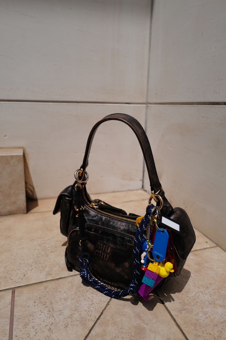ミュウミュウの黒バッグに 青×紫のチャームで デニムコーデが夏らしく