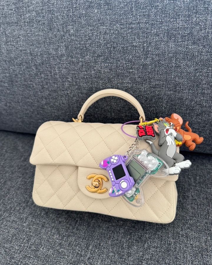 シャネルのワンハンドルを持った キレイめコーデが チャームでポップな印象に