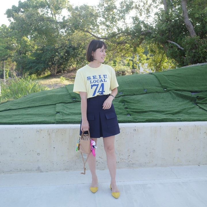 「カッコよくも可愛くも持てるthe highlightsのバッグ。シンプルだから、たくさんチャームをプラスしてもバランスよく仕上がります。この日はサンリオのハローキティ、プラザで見つけたスポンジボブとPEZとバービー、友人からもらったシンプソンズを付けました。好きなものをいろいろ付けたのですが、ピンク系と黄色系など、左右で色合いを統一することだけは意識しました。Tシャツ×ミニスカートのワンツーコーデだったので、チャームもうるさく見えずにポイントに」坂元 久里奈さん・35歳(MONAMOUR・MEMEディレクター/8歳男の子と6歳女の子ママ)