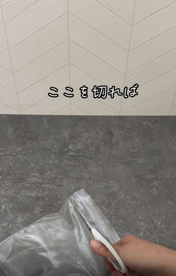 保存袋のファスナー部分をハサミでカットします。どの部分を切ればよいのか困ったときは、画像を参考にしてみてください。