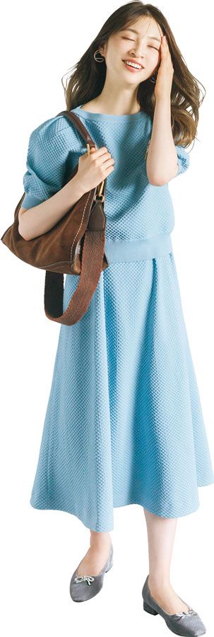 表情のあるニット素材で、シンプルながらシャレ感漂うセットアップ。足元がフラットシューズでも、きちんと見えるからオフィスでも好感度上々♪