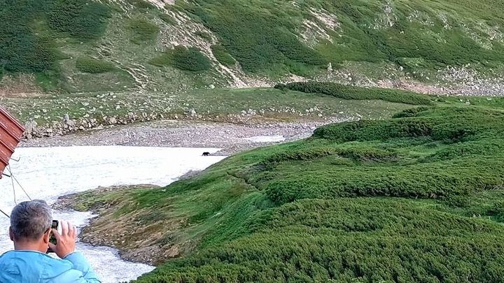 避難小屋からクマの姿が見えた。数人の登山者で距離をとって見守った