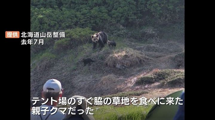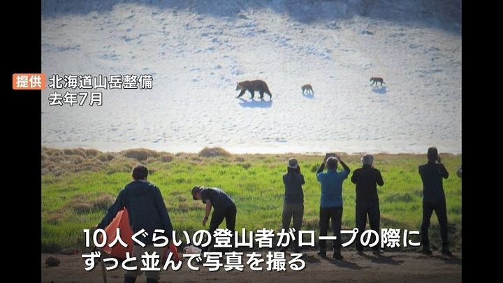 北海道山岳整備の岡崎哲三代表は、「ヒグマが、テント場のすぐ脇の草地を食べに来た。親子クマだった。10人ぐらいの登山者がロープの際に、ずっと並んで写真を撮る。管理人が『できるだけ離れてくれ』と、さんざん声かけしても、登山者は全く動かない」と話します。