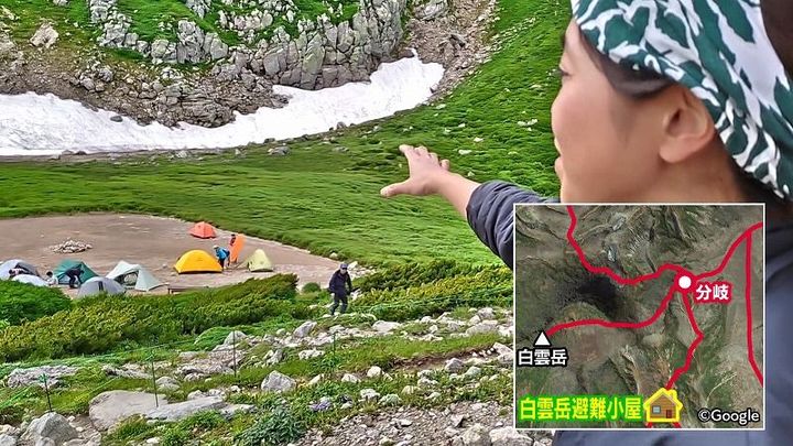 白雲岳避難小屋の管理人・田村萌さんは、テント場で、「雪渓の下に水たまりがあるが、横の斜面から現れたり…」と指さします。