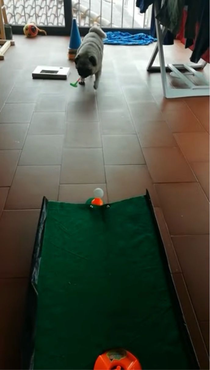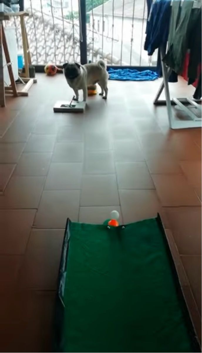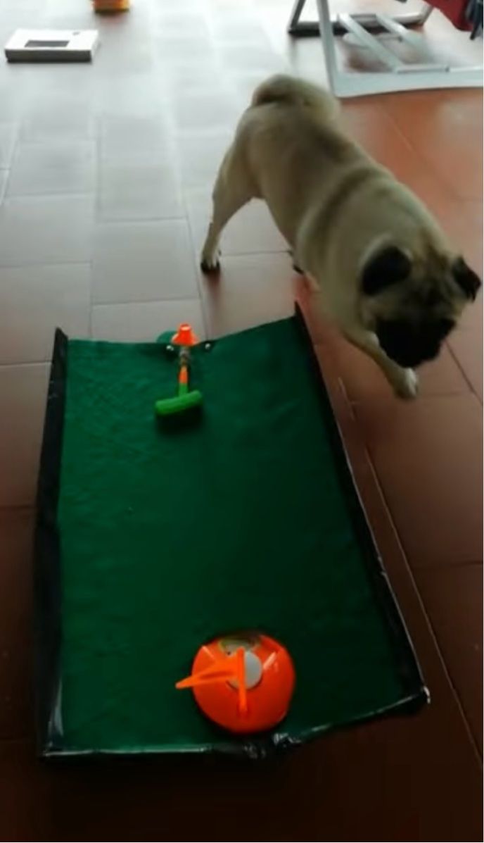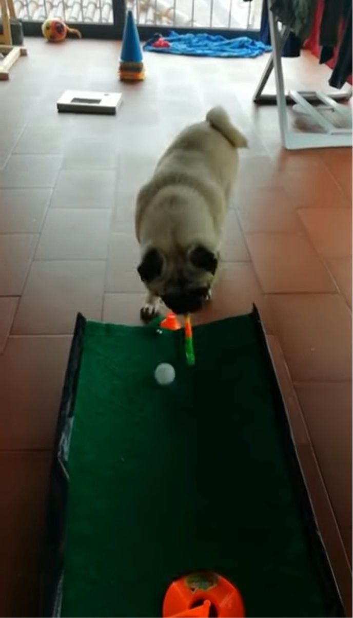 3. パグの特技はゴルフ!?オモチャのパターで見事にカップイン!!【海外・動画】
