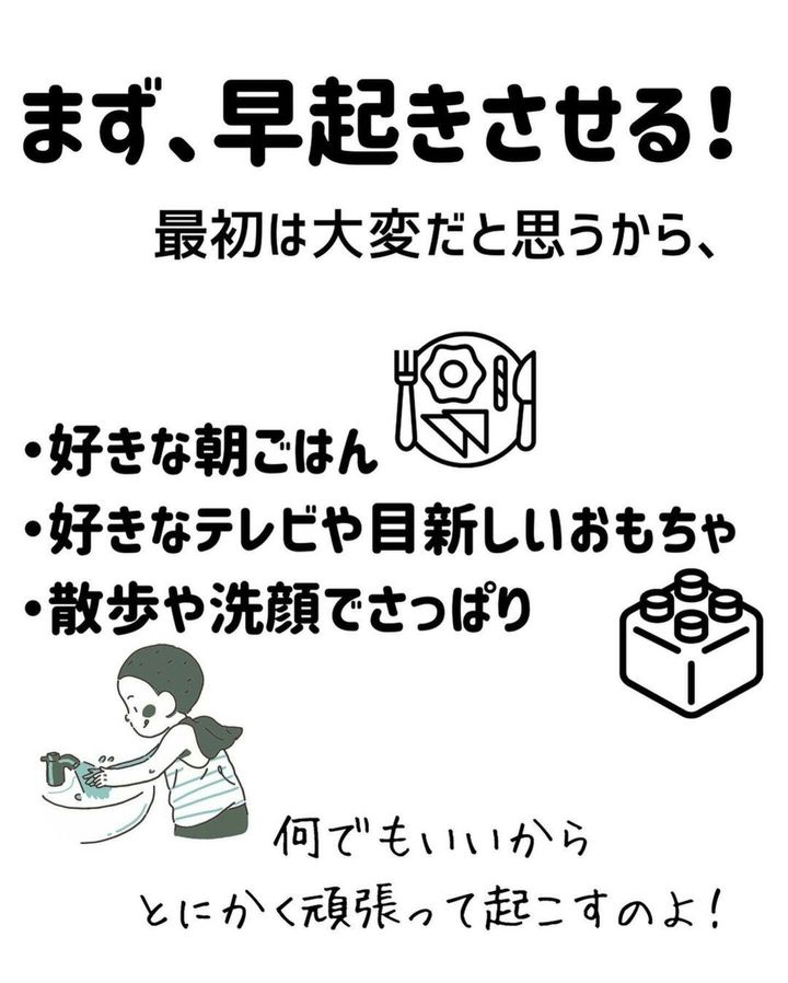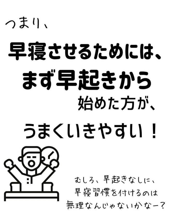 早く起きれば早く眠くなり、寝かしつけもスムーズに。単純なことですが、目からウロコが落ちた方もいるのではないでしょうか?