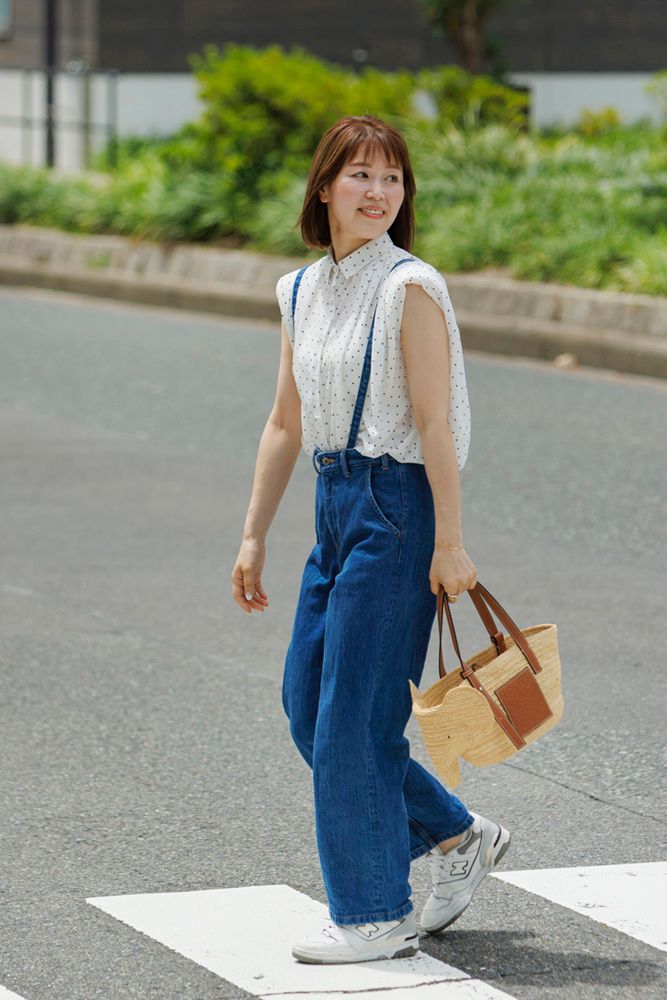 ニューバランス550は、とにかく履きやすく、足の形にピッタリで疲れ知らずなので、色違いで2足、去年の夏に購入。友人とランチの予定なので、cygneのドットブラウスにデニムのサロペットを合わせて足元はスニーカーで軽快に。