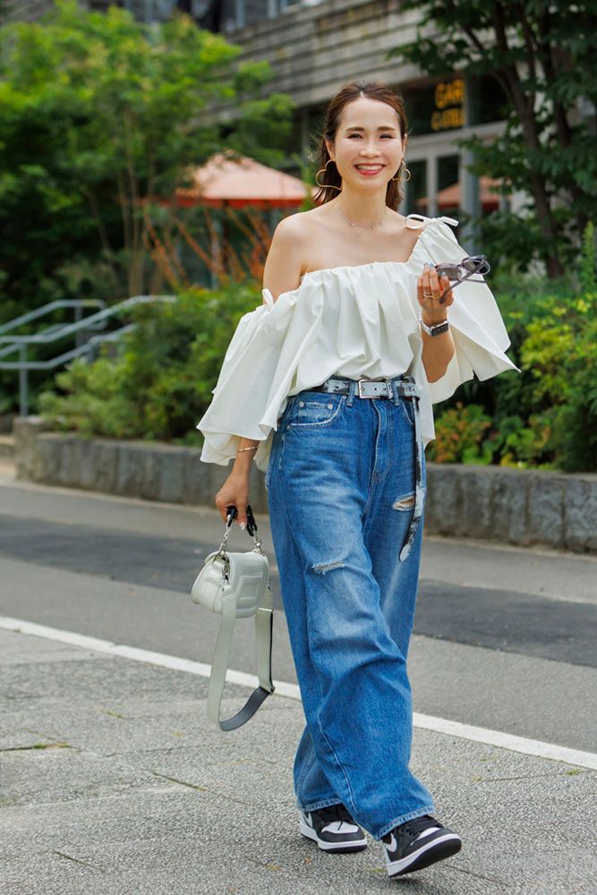 大胆なオフショルトップスを主役にした肌見せコーデはスニーカーを合わせてヘルシーにまとめます。NIKEのエアジョーダンの、特に白黒のパンダカラーが手持ち服を選ばず合わせやすくて、パターン違いで購入しました。バッグを同じ白黒配色で揃えたのもの密かなこだわり(笑)。