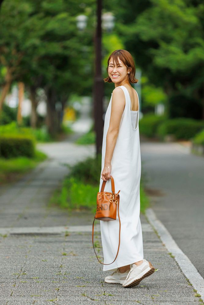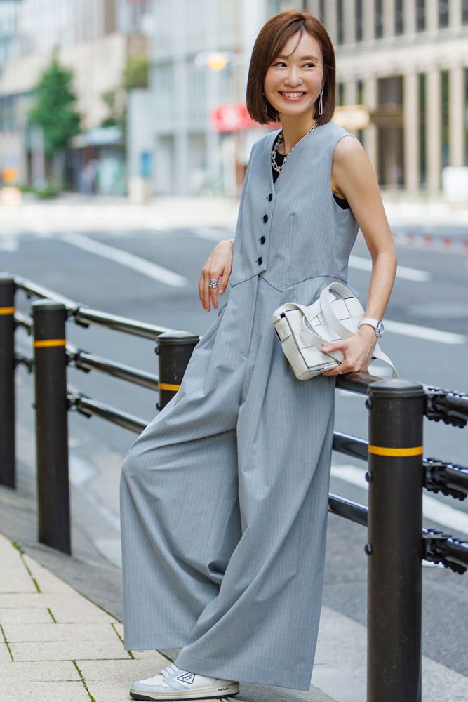 PRADAのスニーカーはカジュアル下手な私のコーデ幅をぐんと広げてくれた一足で、もう3年も愛用しています。今年っぽいマニッシュ感がお気に入りのカデュネのオールインワンは爽やかに着たいので、足元はライトに見えるよう気をつけます。