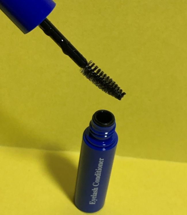 入浴後、早速まつげ美容液を使用してみました。見た目はマスカラと同じ形。ブラシはまつげのカーブに合わせて緩くカーブしていました。パッケージの裏面に「ブラシで美容液をまつげの根元から塗る」と説明。それに従い、まつげの根元から外側へ向かって丁寧にブラシを動かし、ブラシでまつげを持ち上げてカールを作るような感じで塗りました。美容液は透明で、次の日の朝も塗りました。