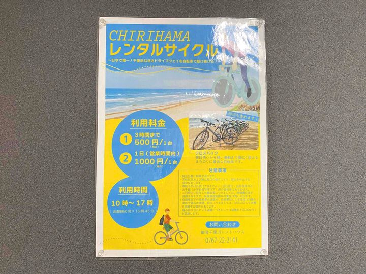 能登千里浜レストハウスからレンタサイクルを利用して、千里浜の浜辺や道路を走り、日本海沿いの大自然を感じることができます。1台3時間まで500円、1日利用は1,000円と良心的な価格帯も魅力。
