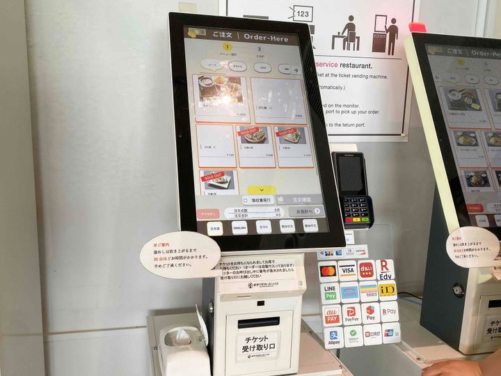 注文は3台の無人機から行います。メニューは画像付きで表示されて選びやすいですし、クレジットカードや電子マネーなど支払い方法があってとても便利でした。