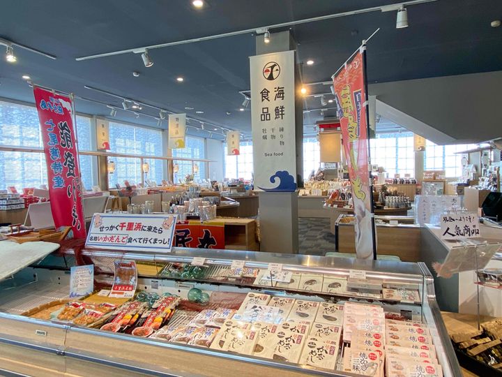 施設の入り口を入ってすぐの場所に大きく展開しているお土産コーナーでは、地元野菜や「珠洲(すず)塩」など、地域の魅力をお持ち帰るできる商品が揃っています。