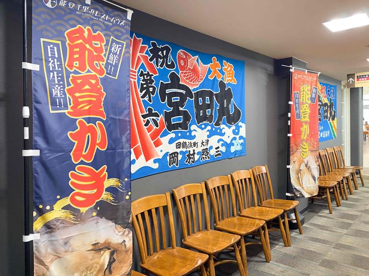 2021年2月にリニューアルオープンしたためか、施設内は想像以上に開放的できれい!大漁旗や能登かきと書かれた旗が飾られた賑やかな通路を通り抜けたところに、海鮮レストランがあります。
