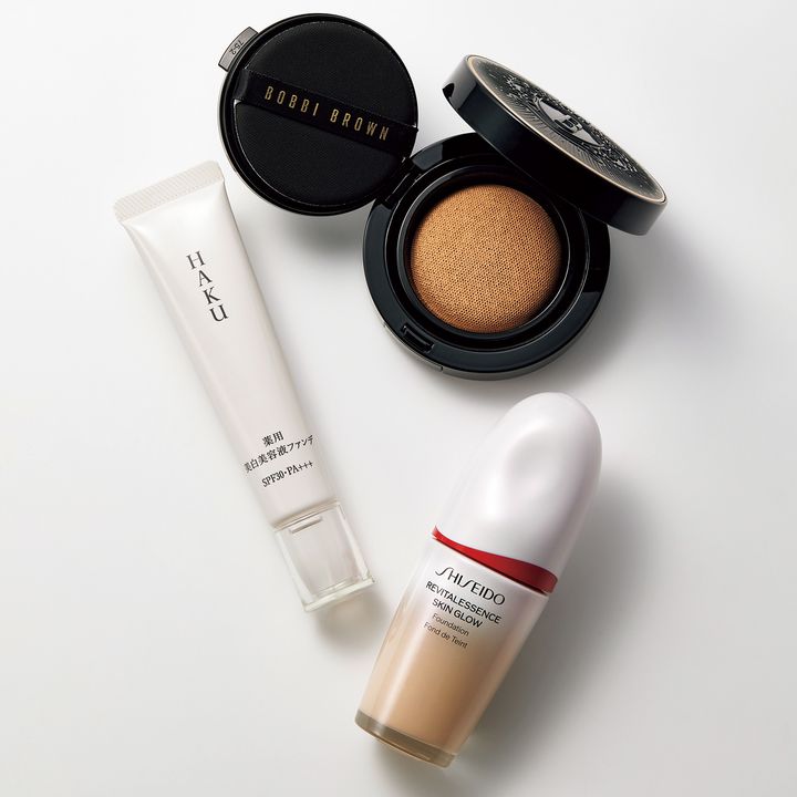 上から:ウェイトレス スキン クッション ファンデーション 全5色 SPF40・PA+++ ¥8,580(ボビイ ブラウン)HAKU 薬用 美白美容液ファンデ 全2色 SPF30・PA+++[医薬部外品]30ml ¥5,280 ※7月21日発売<編集部調べ>(資生堂)エッセンス スキングロウ ファンデーション 全12色 SPF30・PA+++ 30ml ¥7,590(SHISEIDO)