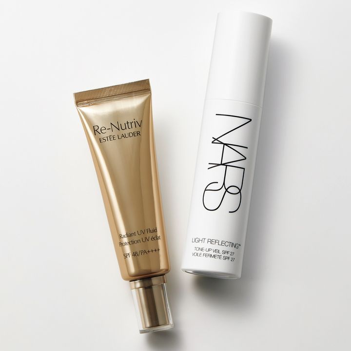 左:薄膜で凹凸も補整。リニ ュートリィブ ラディアント UV フルイド SPF48・PA++++ 30ml ¥15,950(エスティ ローダー)右:光を纏い美肌を装う。NARS ライト リフレクティング トーンアップヴェール SPF27・PA++ 30ml ¥6,380(NARS JAPAN)