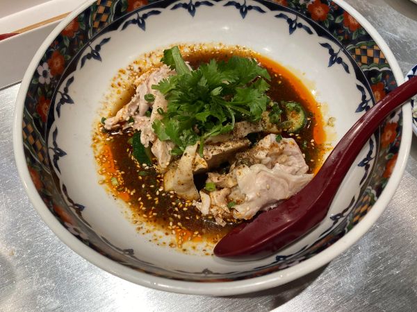 ほとんどのお客さんがオーダーする名物、よだれ鶏。 スパイスや漢方をふんだんに使ったソースを、豪快な鶏肉と合わせた看板メニューです。 深みのあるスパイスの香りが食欲をそそります。 華やかな食器が一層美味しく魅せる、味も、見た目も、コスパも、良好な必食メニューです。