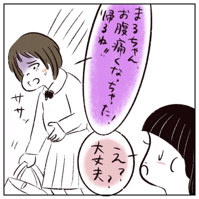 「まるちゃん、お腹痛くなっちゃった!帰るね!」部屋に戻ってきたさなかちゃんは前かがみでお腹を押さえながらササッと自分のカバンを手に取りました。