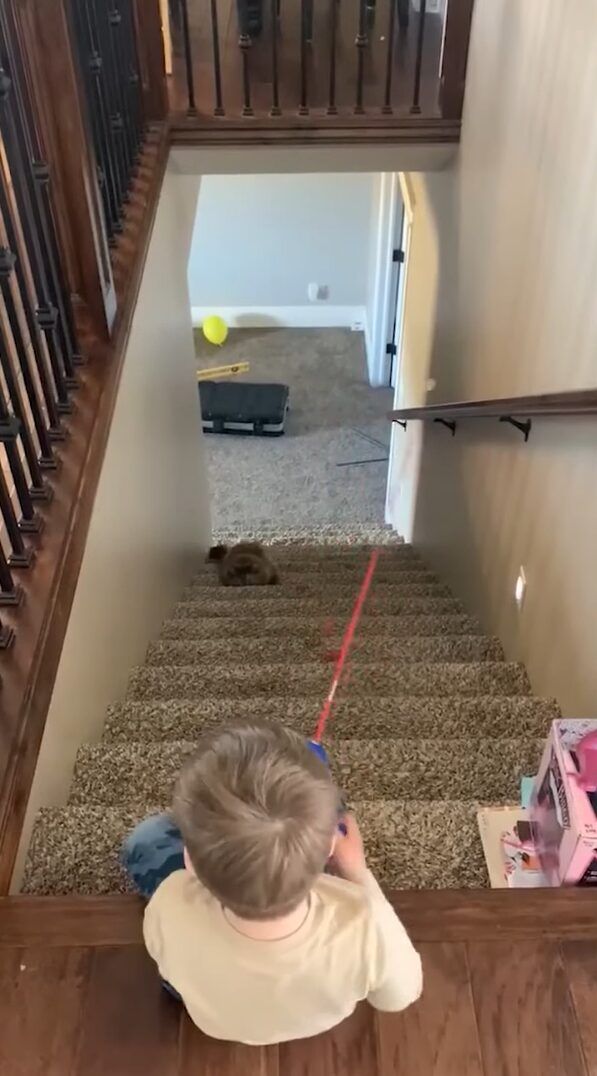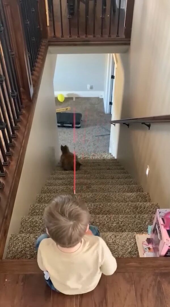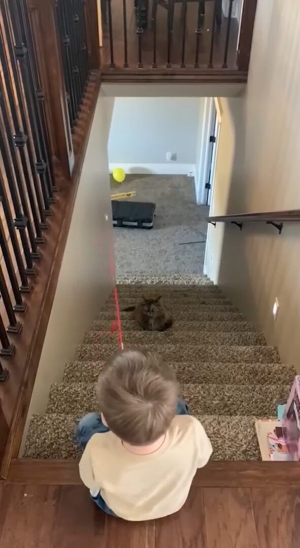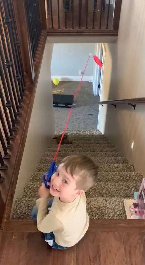 階段の上で愛猫を相手に釣りをする男の子。 その楽しそうな様子は、こちらの動画からご覧いただけます。