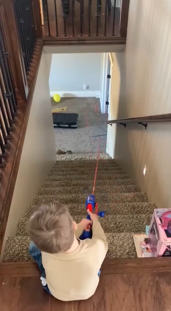 オモチャのルアーが付いた釣り竿を、男の子が階段の下に向けて一投!