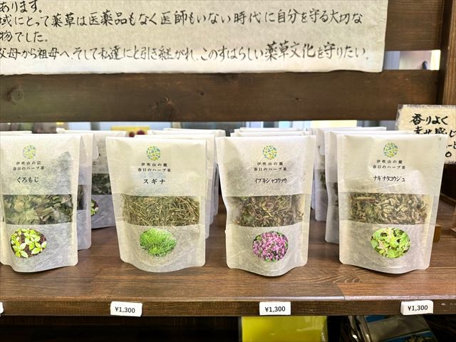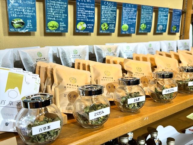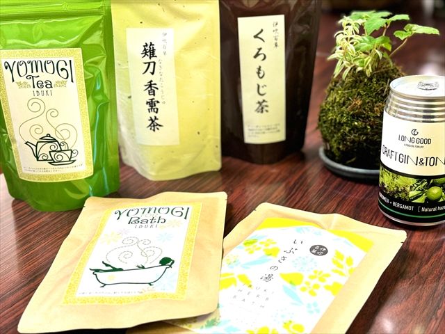 一般的に身近に感じるヨモギをはじめ、クロモジ、ナギナタコウジュなどの薬草を使ったお茶、入浴剤、お酒(ジン)なども販売されている