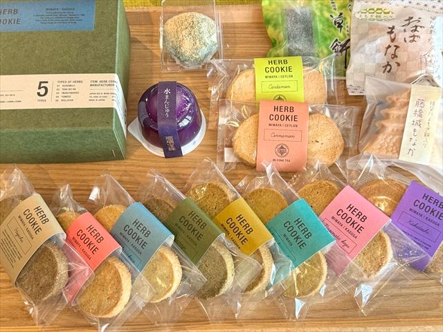 写真下部に並ぶ和ハーブクッキー(各税込150円)は、ヨモギ、クロモジ、トウキ、イブキジャコウソウ、春日ほうじ茶などなど……、ラインナップが豊富。パッケージもおしゃれで味もおいしく、お土産にも買いやすいのがうれしいです。