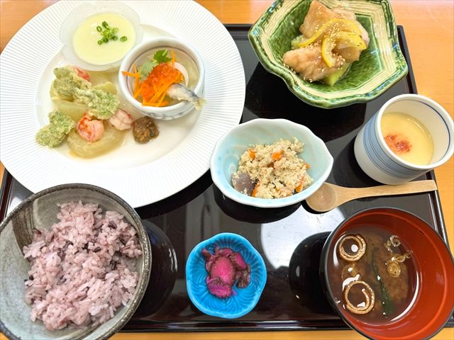 薬膳定食は、春日キュウリや稚鮎など地元の食材に加え、サワアザミ、ドクダミなどが料理やデザートに使われている(2024年8月撮影)