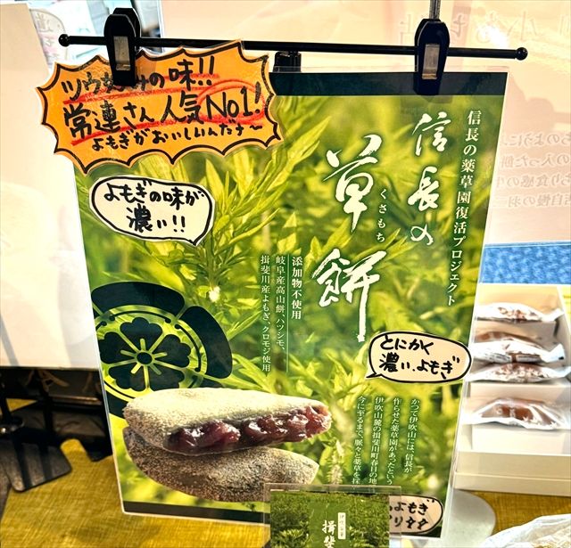 常連さんの人気ナンバーワンは、ヨモギとクロモジを使った「信長の草餅」(税込150円)。一般的な草餅に比べると、ヨモギの味がめちゃくちゃ濃いです!