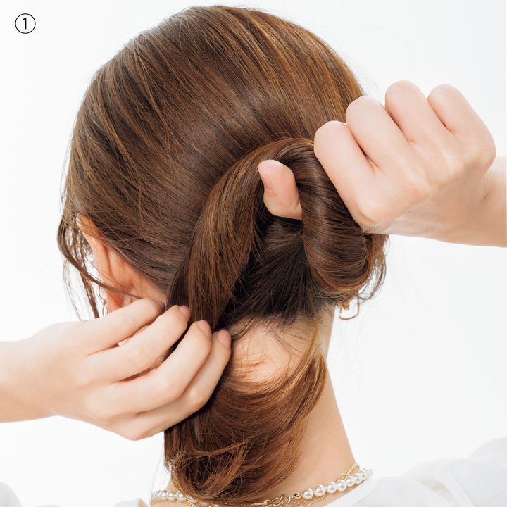 ①ヘアクリームを髪の中間から毛先に手櫛でなじませます。衿足にもしっかりつけて浮き毛をおさえて。後頭部で1本にまとめ、毛束をひねりながら親指にぐるっと絡ませます。