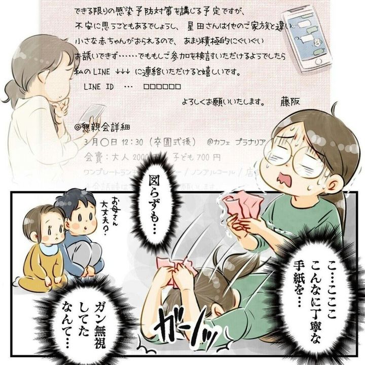 長男・にぃくんの卒園式のあと、ほとんどの保護者の家族が集まって懇親会が開催されました。ところが、星田さんは懇親会に誘われていません…。卒園式のとき、まわりの保護者が「卒園式のあと」のことを話題にしているのを耳にし、「何かあるらしい」と察した星田さん。