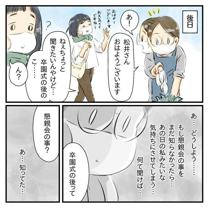 このお話は、著者・星田つまみ(@hoshi.da)さんの長男・にぃくんの卒園式にまつわるお話です。世間は、コロナ禍へ突入。園の謝恩会は中止となり、卒園式が終わってすぐに帰宅した星田さん一家。ところが、どうやら卒園式のあとに保護者同士で「懇親会」が開催されたよう。その開催をまったく知らなかった星田さんは、自分だけ仲間はずれにされたのかもと考えています。後日、懇親会に出席していなかったママ友・松井さんに探りを入れたところ…。『知らないうちに保育園の親たちが懇親会を催していた話』をダイジェスト版でごらんください。
