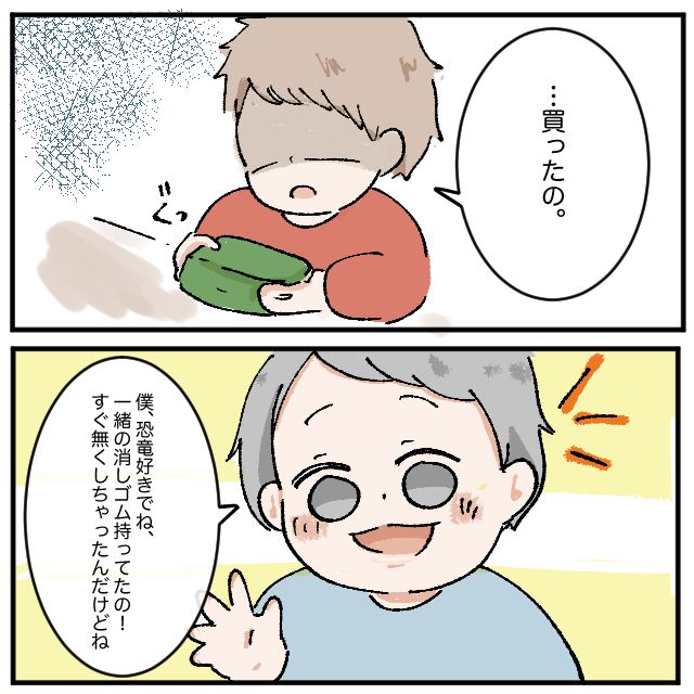 ダイヤくんの筆箱の中に、アサヒくんがなくしたのと同じ恐竜の消しゴムが入っているのを見てしまったママは「かっ、カッコいい消しゴムだね」とダイヤくんに話しかけました。すると「・・買ったの」下を向き筆箱をしっかり押さえながらそう答えるダイヤくん、すると「僕、恐竜好きでね、一緒の消しゴム持ってたの!すぐなくしちゃったんだけどね」とアサヒくんが笑顔でダイヤくんに言いました。
