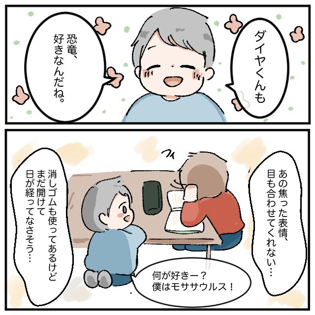 そして「ダイヤくんも恐竜、好きなんだね」と笑顔で言葉を続けます。でも目をそらして何も答えないダイヤくん、その様子を見ていたママは「あの焦った表情、目も合わせてくれない・・消しゴムも使ってあるけど、まだ開けて日が経ってなさそう・・」と心の中で呟きました。