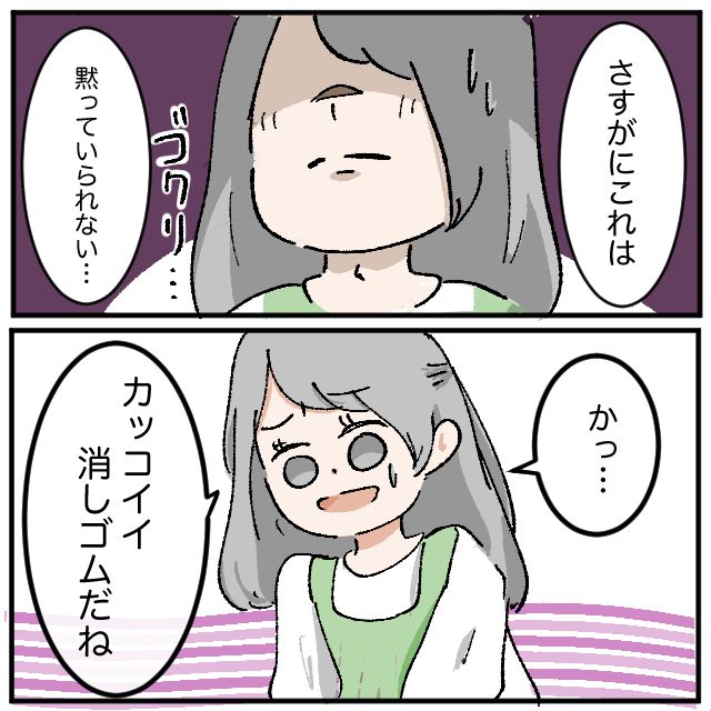そして「さすがにこれは黙っていられない・・」そう思ったママは「かっ・・カッコいい消しゴムだね」思い切ってダイヤくんに話しかけました。