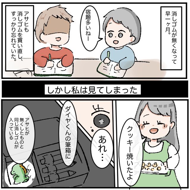 アサヒくんお気に入りの恐竜の消しゴムがなくなって早1ヶ月。アサヒくんも消しゴムを買い直し、すっかり忘れていました。その後、またダイヤくんと一緒にうちで宿題をしていた時のこと、ママは見てしまったのです。「クッキー焼いたよ」おやつを持って2人の所に行った際、「あれ・・ダイヤくんの筆箱に、アサヒがなくしたものと同じ消しゴムが入ってる」ママの心が途端にざわつきました。