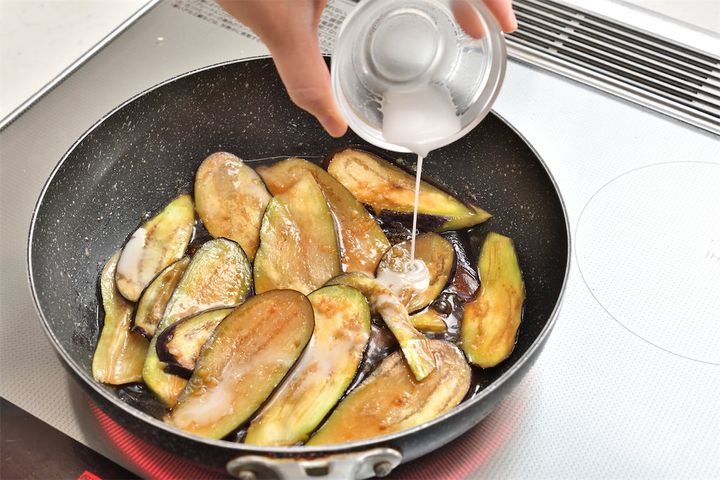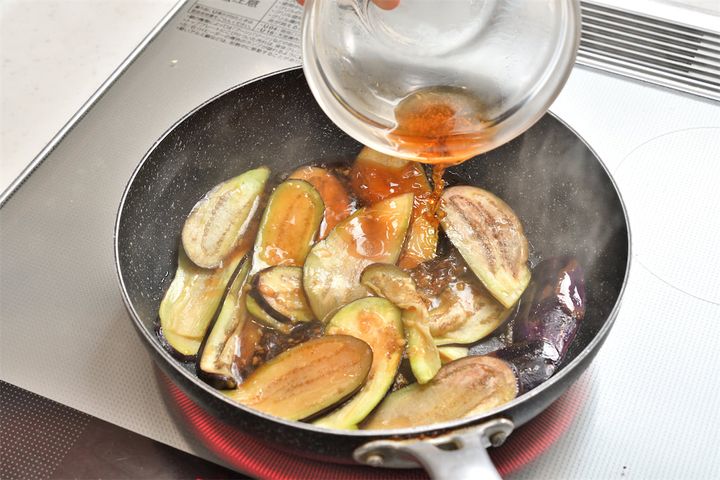 4. なすに焼き目がついたら弱火にして、2を入れる。