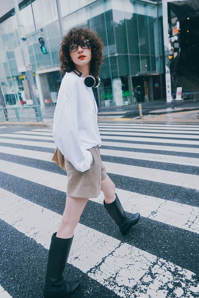 【POINT】肌感を生かせるショートパンツで、ロングブーツを先取り。視線を縦に流せる丈だから、素脚を潔く出してもスタイルアップがかなう。