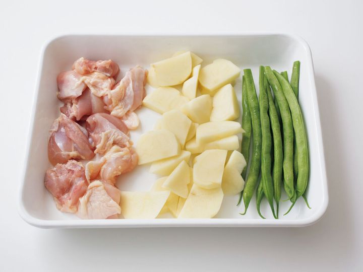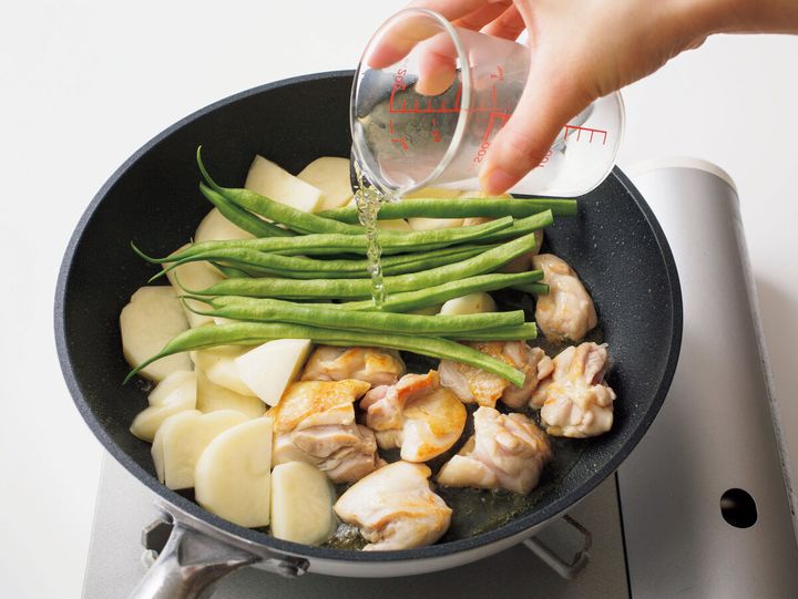 フライパンにオリーブオイル大さじ1を中火で熱し、鶏肉を皮目を下にして入れ、2~3分焼いて返し、さらに1分焼く。じゃがいも、いんげんと、水1と1/4カップ、にんにく、塩小さじ1/2、こしょう少々を加えて強火で煮立て、ふたをして弱めの中火で6~7分煮る。