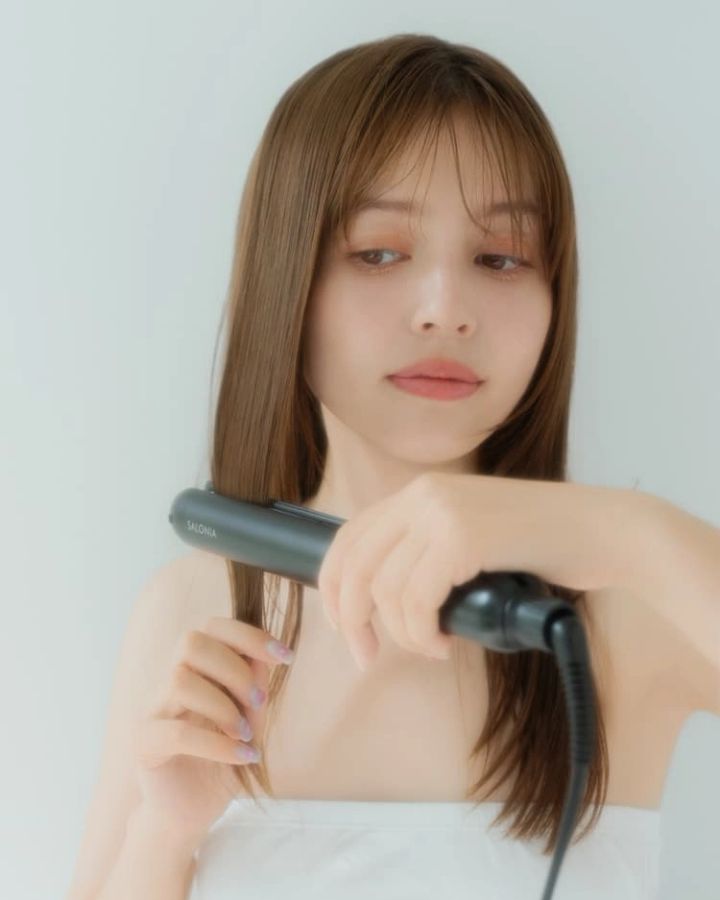表面の髪を少量とり、ヘアアイロンで挟んでスライド。根元から毛先まで、全体に行う。前のブローで髪の流れは整えてあるから、アイロンは表面のみにあててダメージを最小限に。